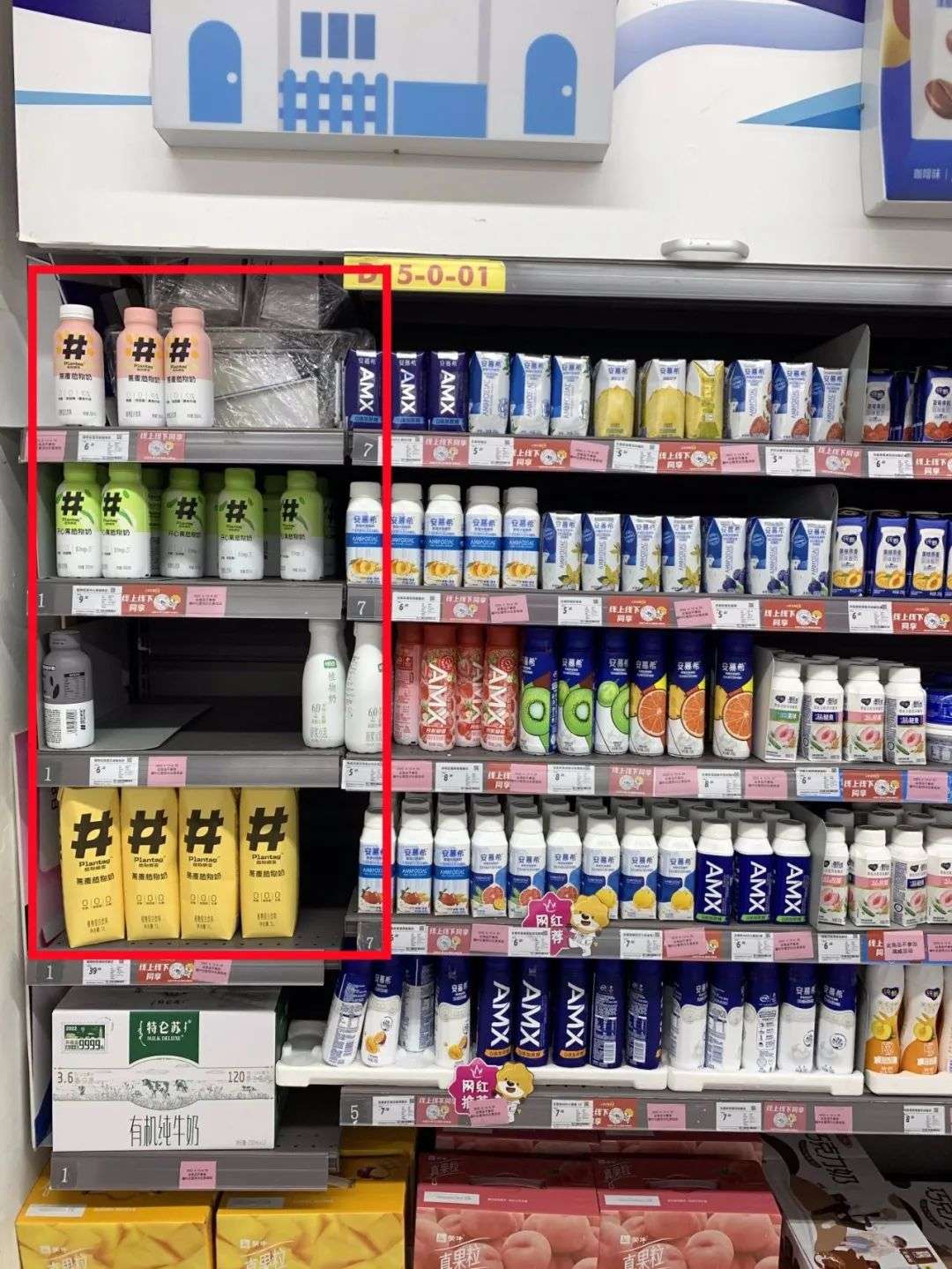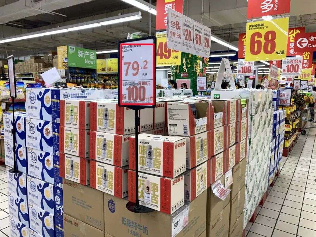 无论是植物标签这样的新品牌,还是伊利植选这样的老品牌,对线下商超的渗透程度超乎想象的低。新响走访了家乐福、物美、华联等多家线下大型商超发现,消费者对植物奶的关注度普遍较低,虽然植物奶被安排在和传统液态奶的同一个区域,但处于边边角角非常不起眼的位置。10名购买常温液态奶的消费者中,无一人在植物奶的货架前停留选购。