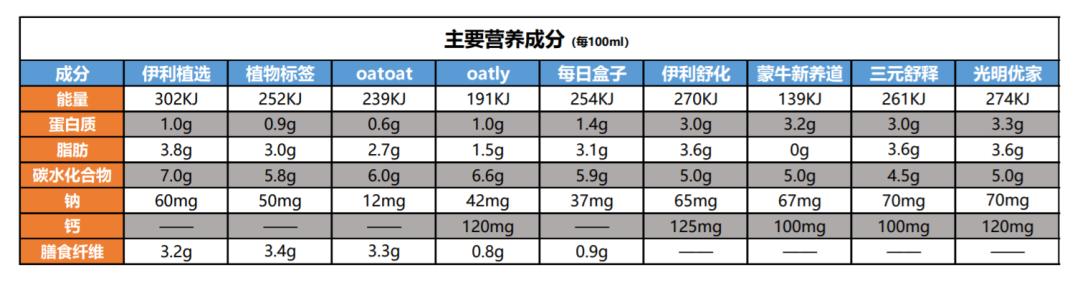 新响分别选取了市面上近期比较常见的植物奶企业的燕麦奶单品和普通传统液态奶的对比发现,在营养成分上,燕麦奶的总热量、脂肪含量等方面,与传统液态奶不相上下,特别是在碳水化合物含量上,燕麦奶普遍高于传统液态奶。