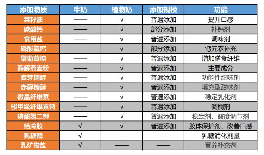 在添加剂方面,植物奶相比传统液态奶普遍添加的更多。其中分为两大类,一是均衡营养类的,如补钙、补充膳食纤维等的添加剂。另一类为口感改善类的,如增稠剂、甜味剂,调味剂等。其中,大豆类、杏仁类的植物奶还可能存在过敏可能。