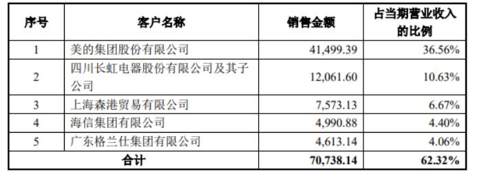 拾比佰的核心客户是美的、长虹、海信、格兰仕等家电厂商,目前拾比佰对这些核心客户的销售收入占比超60%,其中,对美的集团的销售占比增长至35%以上,第二大客户长虹占比仅为10%左右。
