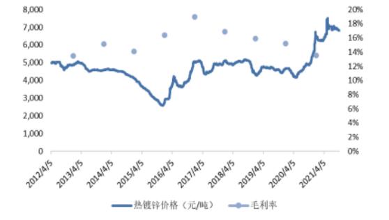 然而,去年至今大宗商品价格通胀走高,也让整个行业“雪上加霜”。一般来说,热镀锌、冷轧板、PVC膜等原材料占到生产成本的90%以上,原材料价格波动势必会对毛利率产生较大影响,钢材基板(主要是热镀锌)对毛利率的影响更甚。