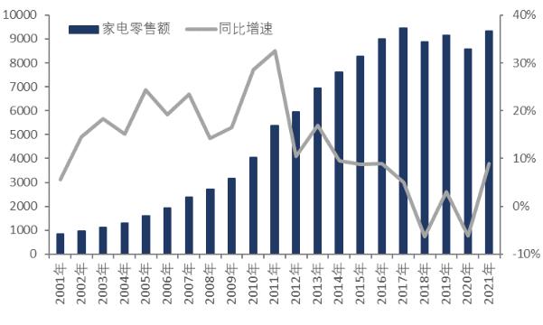 2001-2021年我国家用电器零售额及同比增速,单位:亿元 资料来源:wind,36氪整理