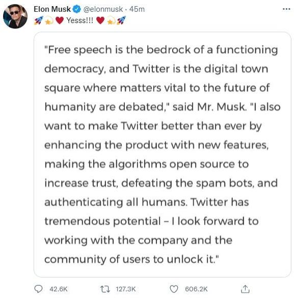 这一点显而易见,Twitter已经同意将自己卖给马斯克“全资拥有”。
