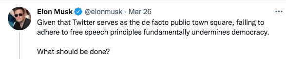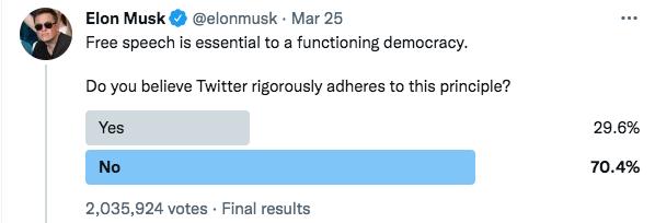 可就在动手之前的一周,3月25日。马斯克曾在Twitter上发布一项投票“你觉得Twitter遵循言论自由原则”吗?问题吸引了超过200万张投票,有70.4%的人认为Twitter并没有遵循该原则。