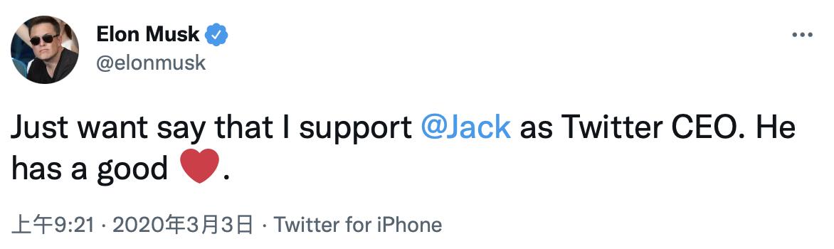 2020年3月,对冲基金Elliott Management对多西发动攻势,并推选新任首席执行官时,马斯克公开表示支持多西,在Twitter上写道:我只想说我支持多西担任Twitter首席执行官,他人很好。并加了一个比心的表情。
