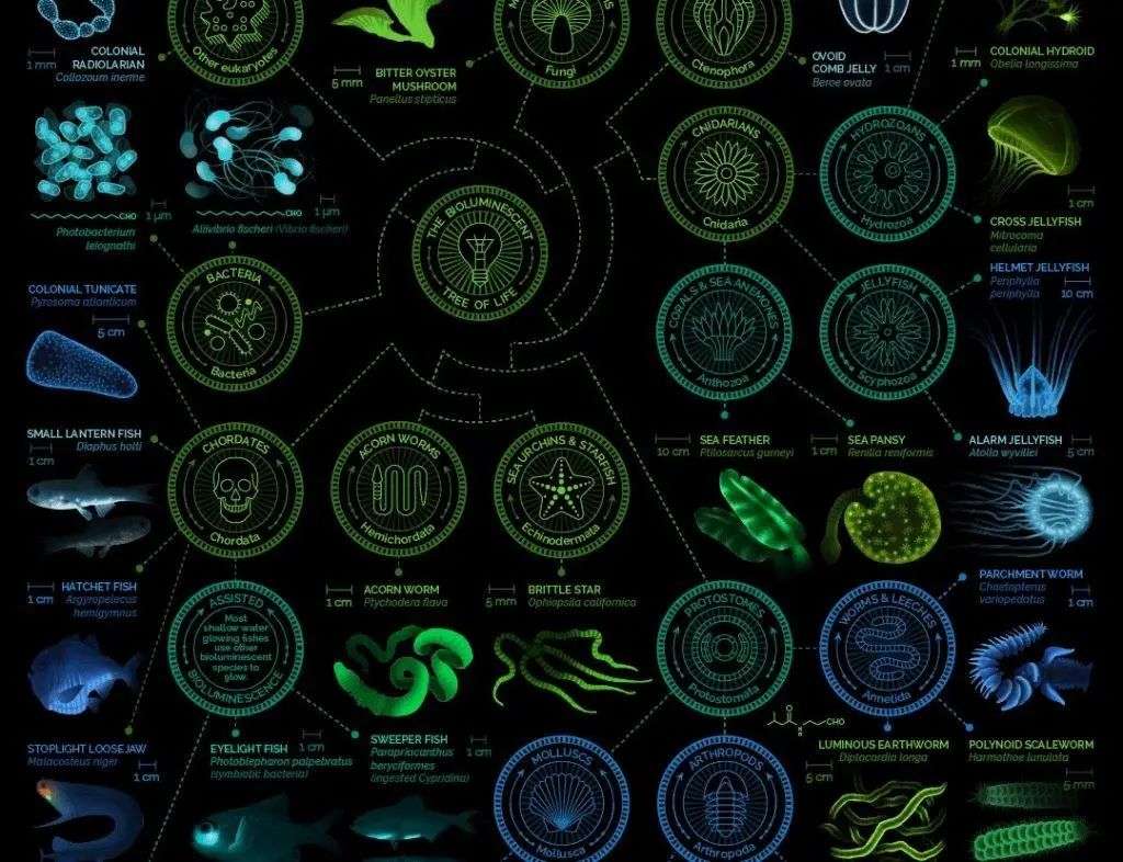 不管是陆地还是海洋,都有许多发光生物的存在:鱼类、昆虫、藻类、植物……尤其是幽深的海底, 有约 76% 的深海生物都会发光,除了鱼类,还有许多会发光的微生物。