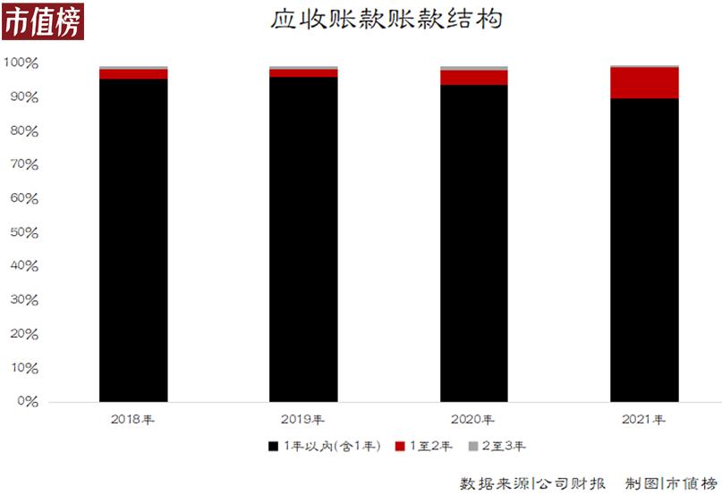 账龄越短风险越低,老板电器绝大部分应收款项账龄在一年以内。但账龄超出一年的应收账款占总额的比例越来越高,2019年是3.7%,2021年上升至10.4%。长期拖欠款越来越多。