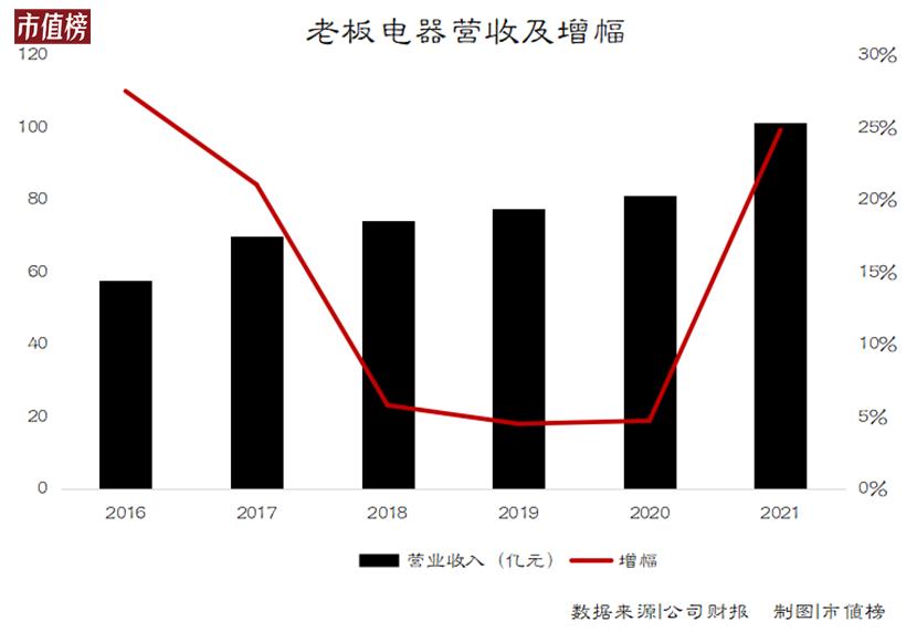 2021年,老板电器收入101.48亿元,同比增长24.84%。而2018年——2020年的增速分别为5.81%、4.52%和4.74%,俨然走到了瓶颈期。