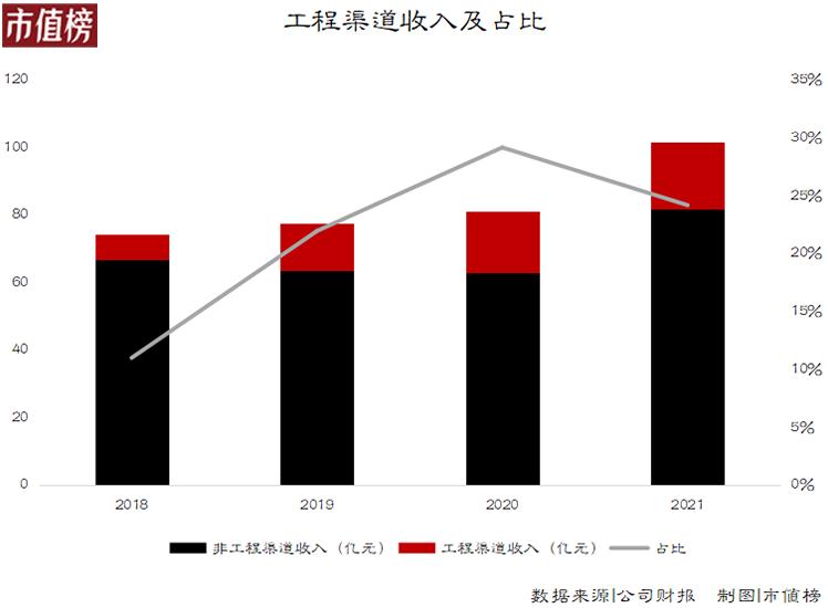 工程渠道的收入占比从2016年的6%左右提升至2020年的23%。