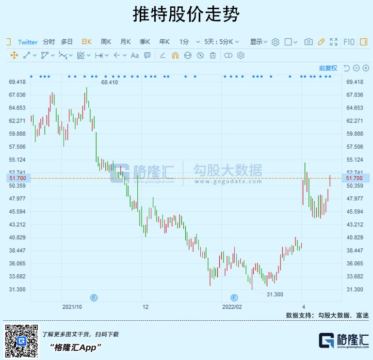 在这个背景下再来看推特股价走势,去年10月以来跌幅最大超过50%,符合美股互联网板块的整体走势。但从3月份传出与马斯克的绯闻以来,反而逆市走出了将近60%的涨幅。