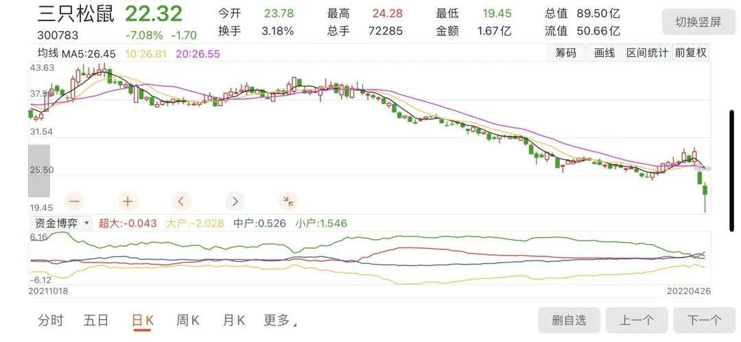 股市方面,和上市初期的股价一路高歌猛进,巅峰时股价91.09元/股,市值超360亿元不同,财报发布前,三只松鼠股价报收29.27元/股,截至4月26日收盘,三只松鼠报22.32元,跌幅7.08%,盘中曾跌超20%,总市值仅89.5亿元,不到巅峰时期的1/4。
