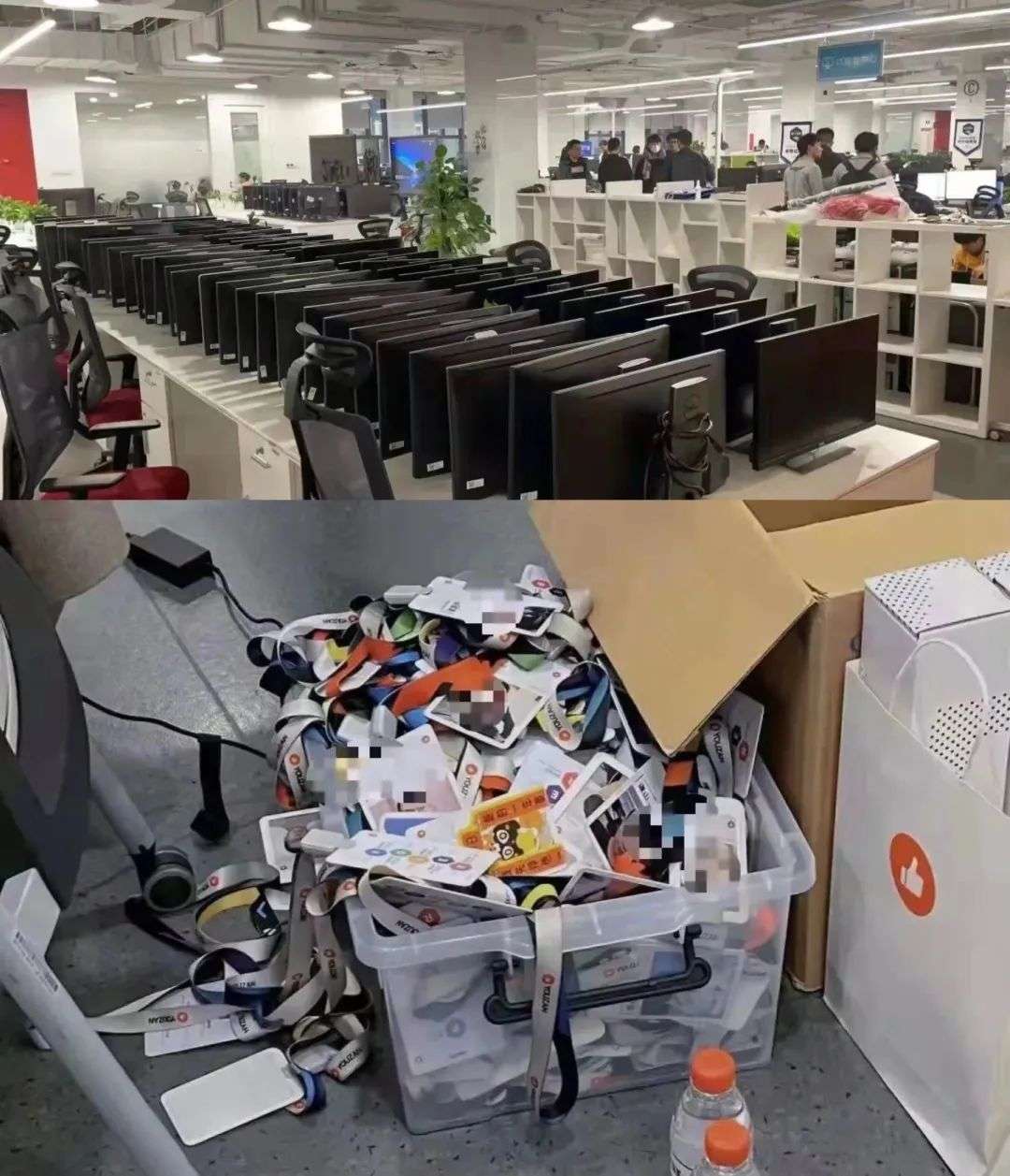 一份广为流传的裁员信里,HR把离职手续写成了“毕业须知”,强行恭喜员工从公司顺利毕业。两张有赞的公司照片也颇为惊人:被裁员工的工牌装了满满一大箱,闲置的电脑显示屏摆满半层楼[12]。