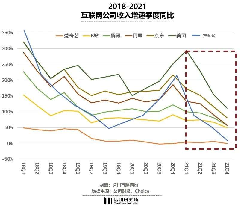如下图所示,主要互联网公司的收入增长正在持续下滑,甚至不乏探底,比如爱奇艺的收入同比增速已经在底部拉成平缓的线,电商奇迹拼多多的增速2021年四季度只有2.5%左右。
