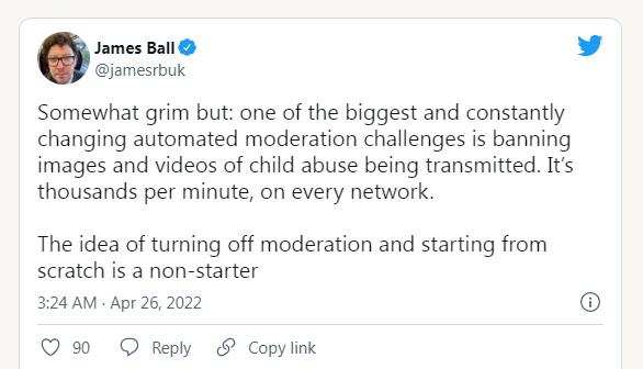 说到内容审核,埃隆·马斯克其实不知道自己在说什么。马斯克建议的一些改变是推特已经试着去做,甚至已经实施的事情。我坚信,马斯克只有在跟他的用户体验(至少可以说是一种独特体验)相关的时候才会把推特当作一项服务。正如推特的一位前高级员工今天早上对我所说那样,马斯克关于改进这项服务的想法大多是“高度的唯我主义,只关心他作为一个有 8000 万粉丝,以及跟 SEC 签了和解协议的用户对这个产品的体验。”