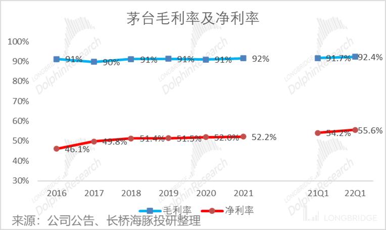 4.2022 年第一季度公司净利率 55.59%,同比 +1.42ppt,长桥海豚君认为一季度公司净利率提升,主因产品提价及结构提升。1 月公司对珍品茅台、茅台 15 年等非标产品,以及金王子、酱香经典王子等系列酒进行提价,且部分非标产品配额转移至直营店打款,直营渠道占比提升。同时,公司推动系列酒及非标茅台的产品结构升级。