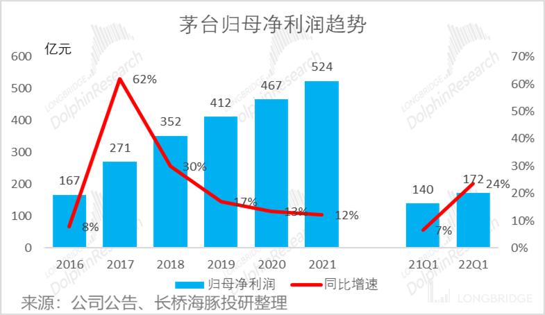 贵州茅台 22Q1 单季实现营业收入 331.87 亿,同比增长 18.25%,实现归母净利润 172.44 亿,同比增长 23.58%,此前市场普遍预期单季营收和净利润的同比增速分别为 18% 和 19%。
