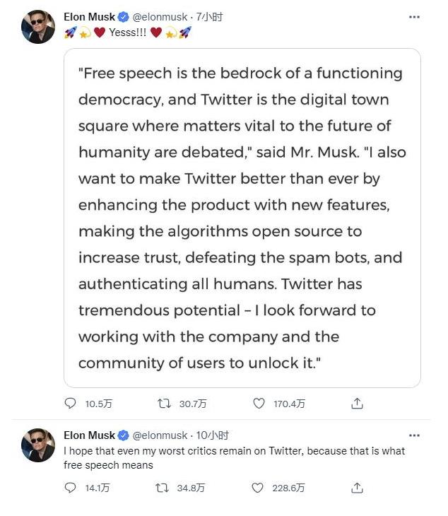 在收购后,马斯克提到他希望推特变得言论自由。