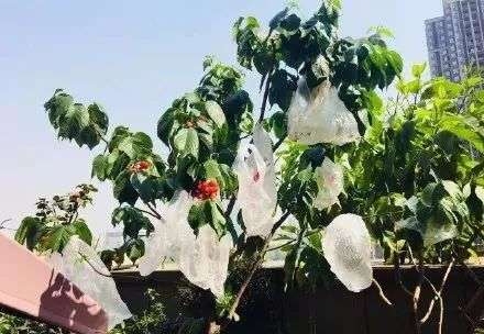 此时家有樱桃的四川人,就不得不进入从鸟雀口中“夺食”的战场:院子里、果园中各种奇形怪状的稻草人就此上线,家里长年累月囤的塑料袋也派上用场,成了一簇簇恩特儿成熟前的特殊着装。