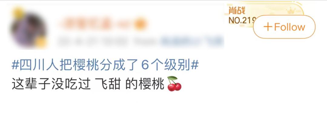 四川人为樱桃设的四六级考试是这样的:“溜酸”、“jiu酸”、“qing酸”,“咪咪甜”、“min甜”,直到“飞甜”。