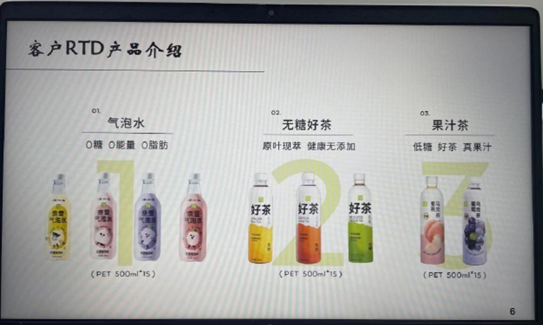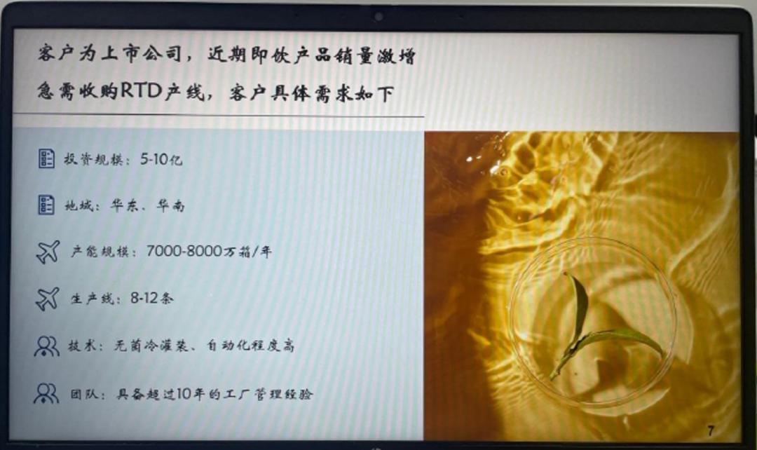 该上市公司对RTD产线的具体要求为:地域集中在华东、华南;产能规模达到每年7000-8000万箱;生产线要有8-12条;技术要求无菌冷灌装、自动化程度高;团队具备超过10年工厂管理经验……巧合的是,从另一张客户RTD的产品介绍图来看,该上市公司或是“新式茶饮第一股”奈雪的茶。
