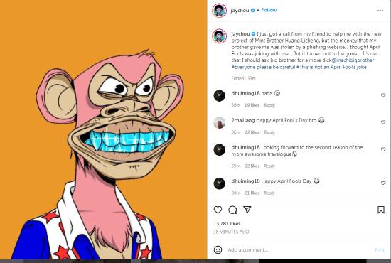 4月伊始的愚人节,天王周杰伦就在INS上“哭诉”,自己持有的价值超过300万元的“无聊猿”BAYC#3738 NFT被盗了: