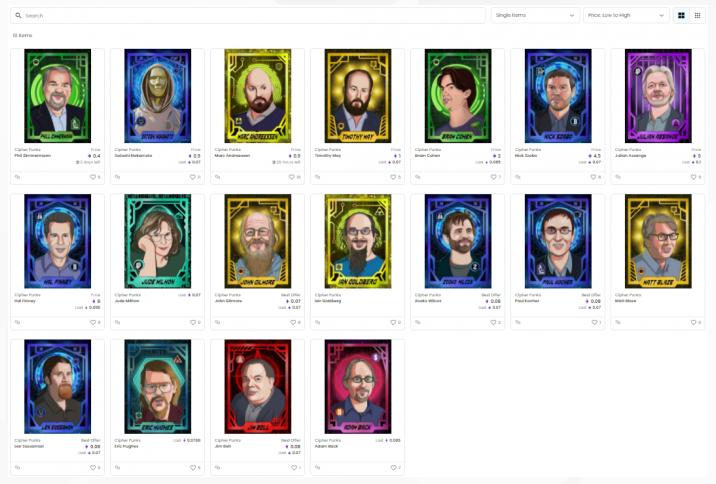 不光是Jillian York,这套由一名叫“It'sBlockchain”的组织发布了名为“Cipher Punks”的NFT资源包,涵盖了46位不同人物的肖像,每个肖像令牌都有10个副本。其中的槽点不止是未经允许发行,还包括拼错了多位人物的名字。