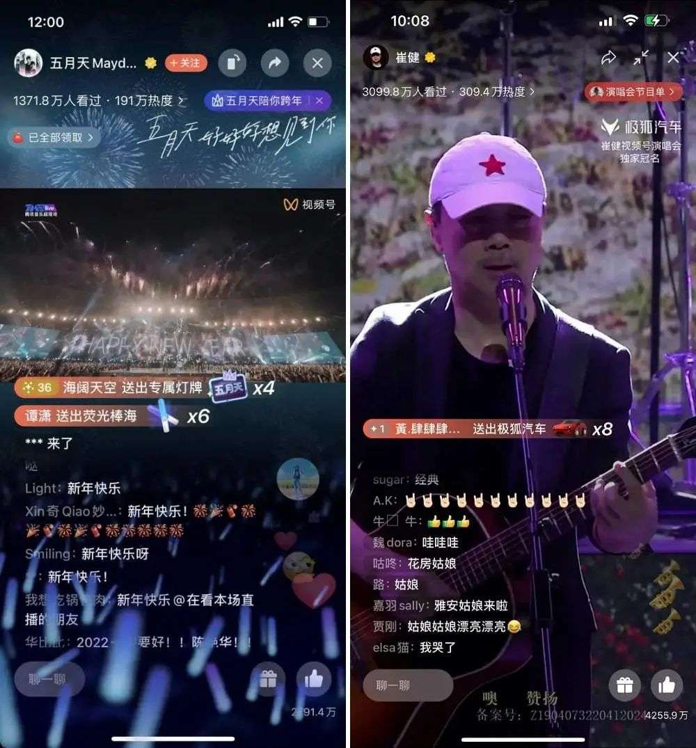 在疫情导致各地线下音乐会不能举办的形势下,微信视频号凭借线上演唱会吸引大量的微信用户使用视频号。微信号陆续邀请了西城男孩,五月天,崔健举行线上演唱会,累计观看人数均超千万次,这显示了视频号在微信生态下强大的传播能力,而这无疑给增长见顶的抖音带来了压力。