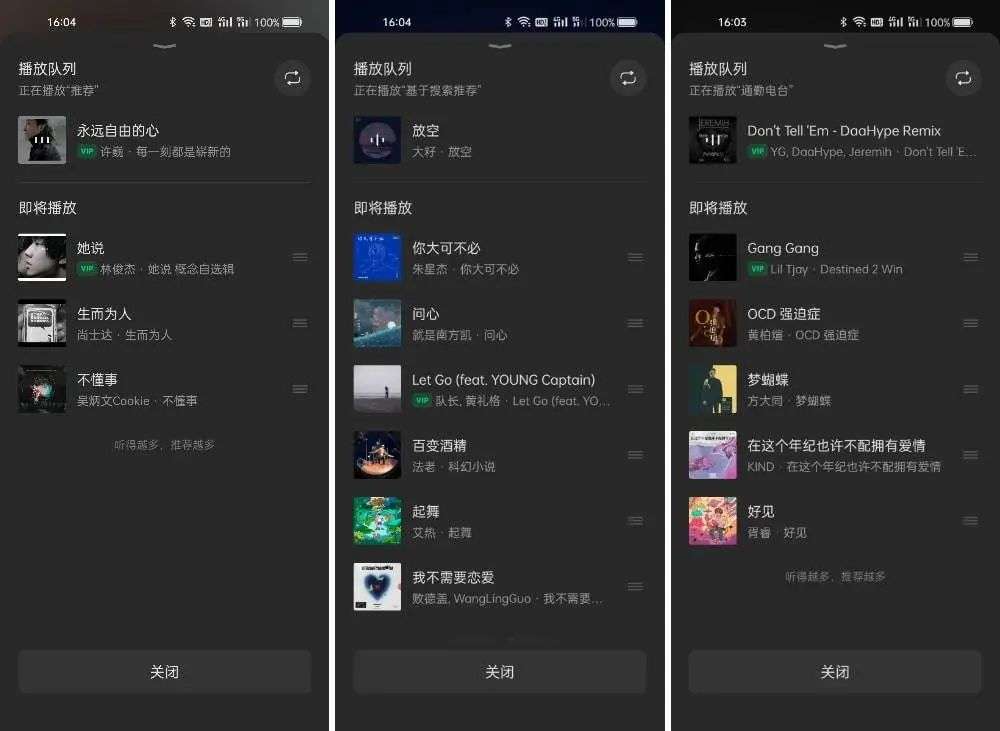 在歌曲播放界面的「播放队列」里,可以看到算法推荐的之后要播放的歌曲,下方有会有小字提示「听得越多,推荐越多」,从而即将播放的歌曲是随着用户在歌曲间切换不断更新的。