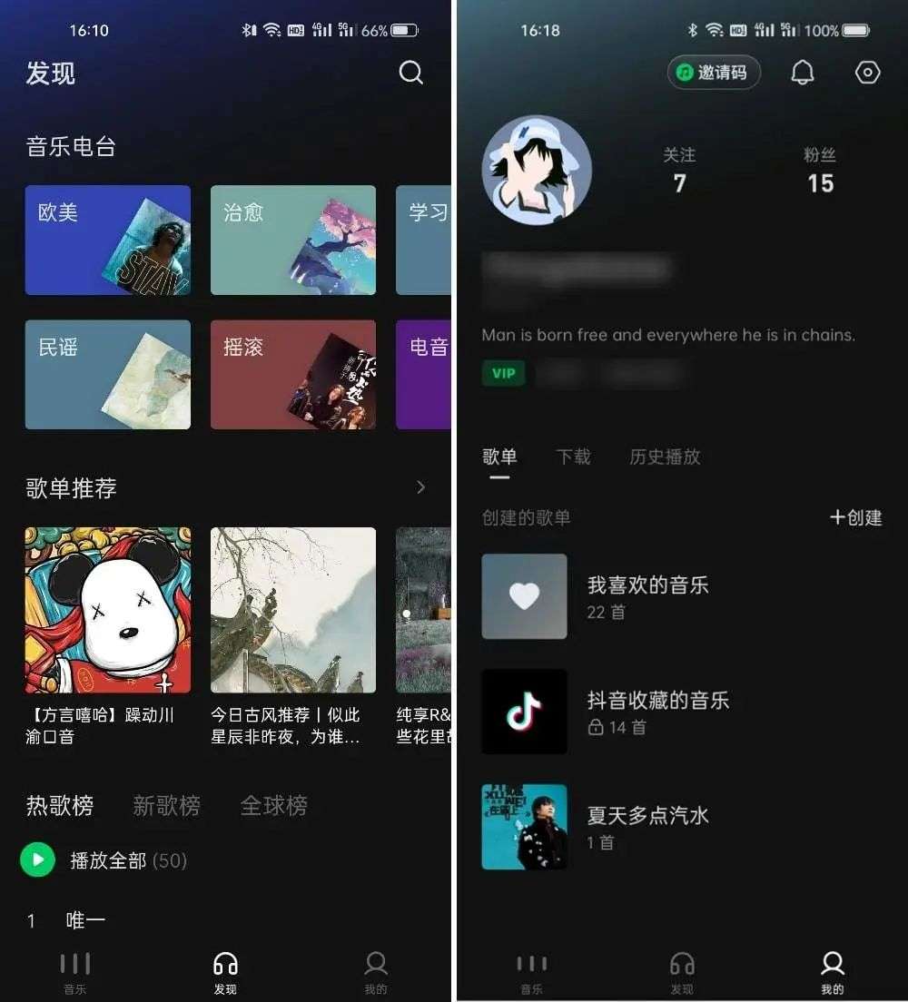 「我的」则是进入个人信息页,在这里可以查看喜欢的音乐,收藏的歌单和专辑,以及下载和历史播放记录。