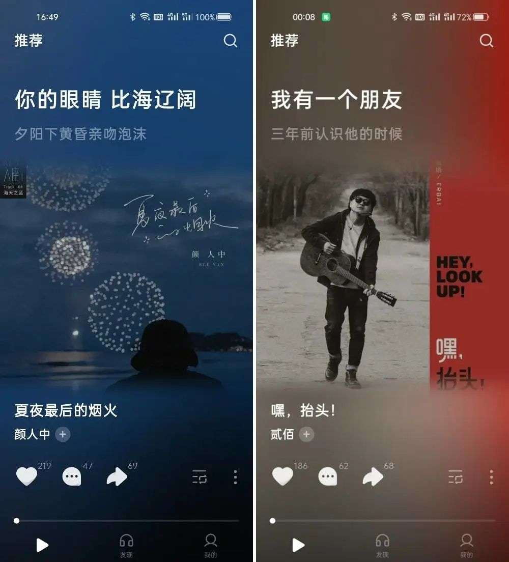 进入主界面,《汽水音乐》的界面与 Resso 高度相似,两者都有别于市场上主流音乐播放器的交互方式,选择了与抖音相似的上下滑动逻辑来切换歌曲。