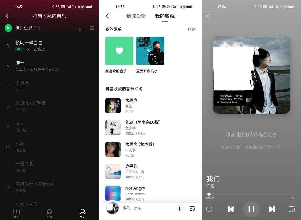 使用抖音的用户可以无缝的在《汽水音乐》上收听在抖音上收藏过的歌曲,并在字节强大的算法推荐里找到更多喜欢的歌曲。