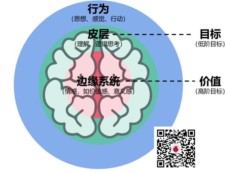 从这幅图中,可以看到,我们的大脑结构决定了人类行为的底层逻辑是:价值驱动并统领目标,然后驱动行为(含思维、感觉和行动)。