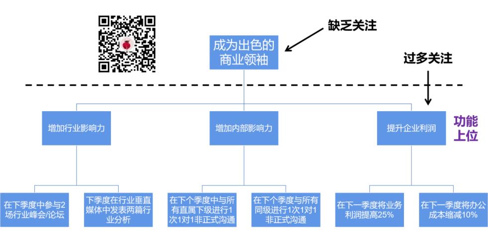 为了实现这个高阶目标,他决定在“增加行业影响力”、“增加内部影响力”、“提升企业利润”这三方面做出努力,为此,他还制定了对应的行动计划。