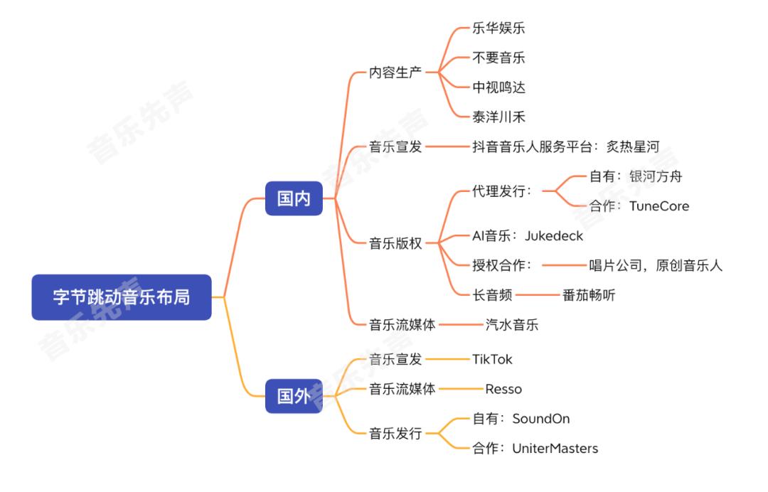 一方面,字节跳动通过投资和自身业务升级来形成一条从内容生产、音乐宣发到版权代理发行、流媒体的全产业链。例如,字节跳动就是通过投资乐华娱乐、不要音乐等内容公司,夯实供给端。另一方面,从横扫全球的短视频平台TikTok、海外音乐流媒体服务Resso、发行平台SoundOn到本土市场的抖音、汽水音乐,字节跳动在国内、国外两条线的发力,也为后续发展j积蓄着能量。