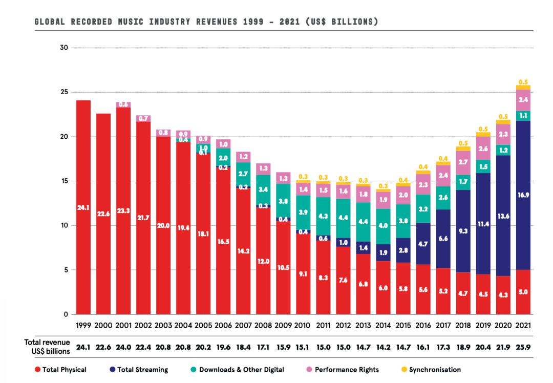 根据IFPI的数据,2015年全球录制音乐产业创造了147亿美元的收入,其中仅有28亿美元来自流媒体,占比为19%,下载和其他数字音乐的收入为38亿美元,占比35.8%。而2021年,全球录制音乐产业创造了259亿美元的收入,其中有169亿来自流媒体,占比高达65%,而下载和其他数字音乐产业的收入为11亿美元,占比为4%。