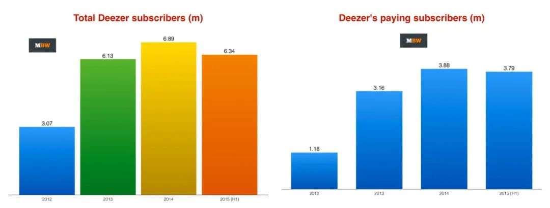 最先摆在Deezer面前的问题是用户流失。截至2015年6月30日,Deezer的全球用户总数同比下降超过50万。而Deezer的活跃用户结构也不尽如人意,在634万的付费用户群中“每月不活跃的捆绑订阅用户”高达334万,占比超过53%,而这一部分用户实际上并没有支付任何费用。