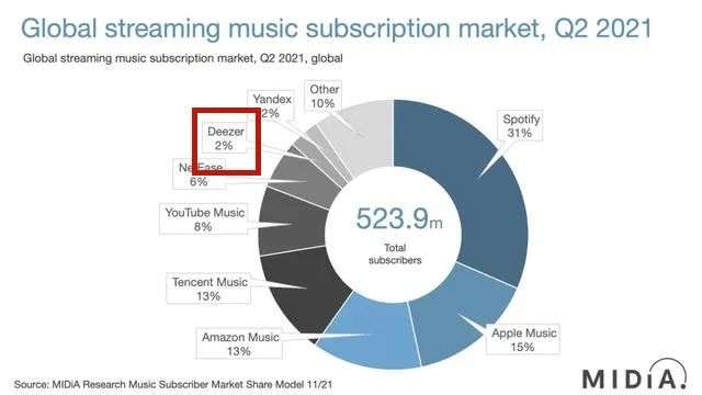 2019年,Deezer称自己拥有1600万月活用户。而据Midia Research数据显示,截至去年6月底,Deezer在全球所有音乐流媒体付费用户中的份额为2%,倒推其付费用户大约有1050 万订阅者。