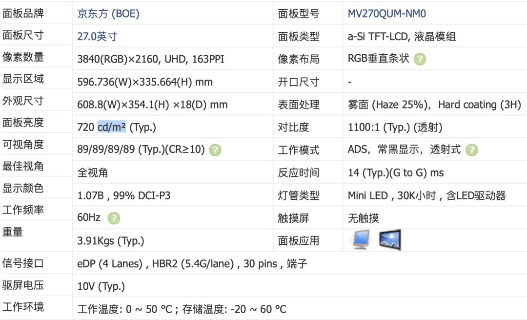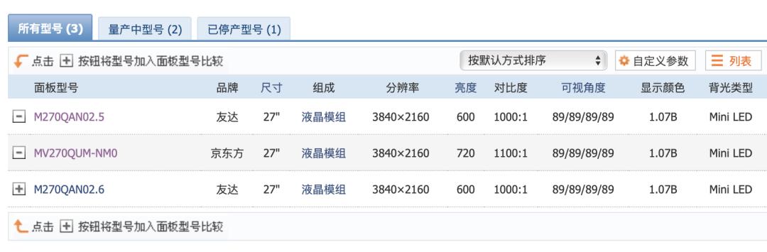 那么这些品牌的mini LED面板都是从哪里来的呢?没错,还得是我们耳熟能详的友达和京东方。在Panelook屏库根据“27英寸”、“3840×2160”“mini LED”这三个关键词进行筛选,能找到三个不同型号的屏幕面板,其中有货的型号有两个,分别是来自友达的M270QAN02.5和来自京东方的MV270QUM-NM0。而市面上绝大多数的4K miniLED屏,说到底都是这几款面板经过不同品牌“软包”后的具体体现。