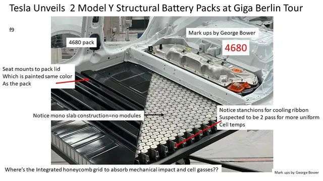 这是特斯拉柏林超级工厂展示的CTC电池方案。这张图相信很多人都很熟悉。看得出,特斯拉直接把4680圆柱形电芯排列在底盘上,电池舱前后直接连接起两个车身大型铸件,座舱地板没有了,以电池上盖代替,座椅则直接安装在电池上盖上。