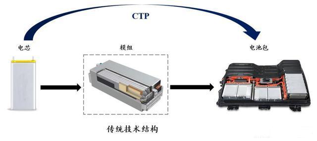 目前采用的最多的CTP方案则是省略了模组的步骤,将电芯直接集合成电池包安装到底盘上。