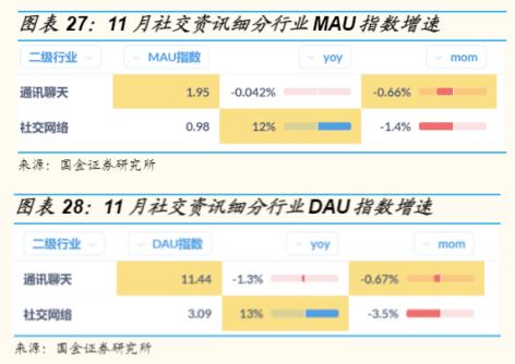 据国金指数,2021年11月通讯聊天类APP的MAU同比降低 0.042%,社交网络类同比增长12%。11月通讯聊天类DAU同比降低1.3%,社交网络类同比增长13%。