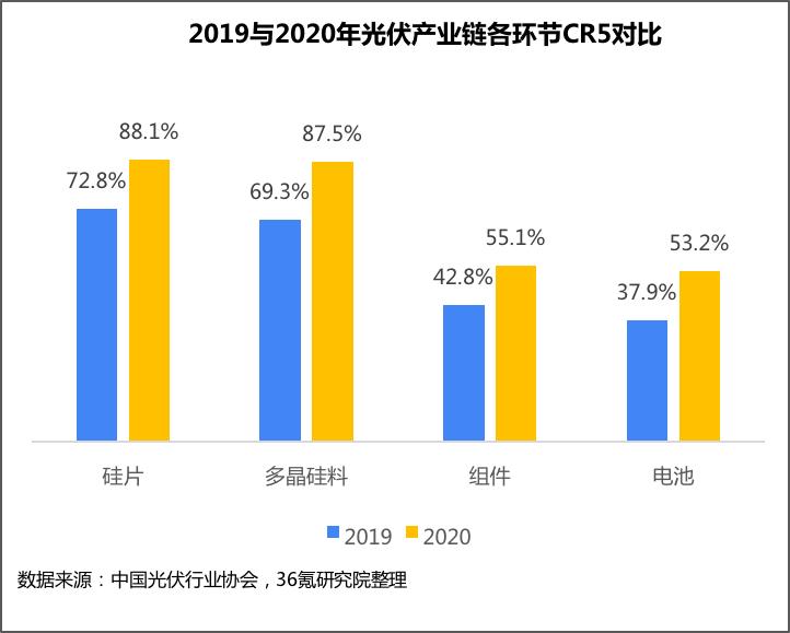 受供需关系及上下游产能不均影响,我国光伏产业已由原来的卖方市场逐渐转为买方市场,产业链单一环节获取利润的稳定性受限,推动部分龙头企业完善光伏全产业链业务布局,加快产业链垂直一体化拓展,以拓宽利润来源,强化竞争壁垒,从而推动我国光伏产业集中度的上升。根据中国光伏行业协会的数据,截至2020年底,光伏产业链各环节CR5分别为:硅片88.1%、多晶硅料87.5%、组件55.1%、电池53.2%,较2019年分别上升15.3%、18.2%、12.3%和15.3%。未来,随着已具有先发优势的企业持续深耕全产业链规模化布局,光伏产业集中度有望不断上升,进一步挤压“长尾”企业利润空间。