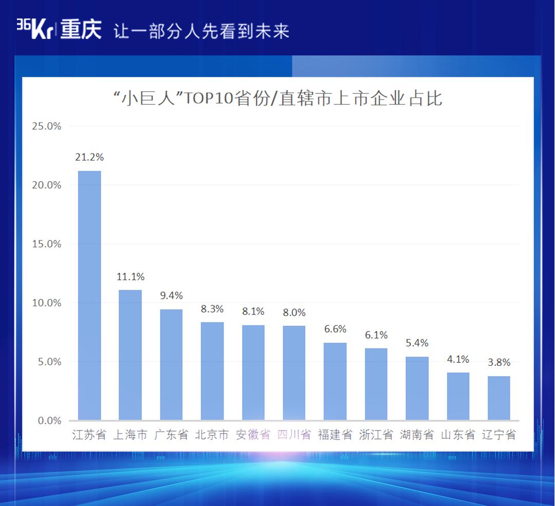 从“小巨人”上市企业的占比来看,江苏在TOP10省份中领先,占比达21.2%。其次是上海,占比为11.1%;广东以9.4%的占比位列第三。数量排名第一的浙江省在上市占比中以6.2%排名第八。重庆市的上市“小巨人”占比为2.4%,相比TOP10省份中的最后一名辽宁3.8%的上市占比仍有一定差距。