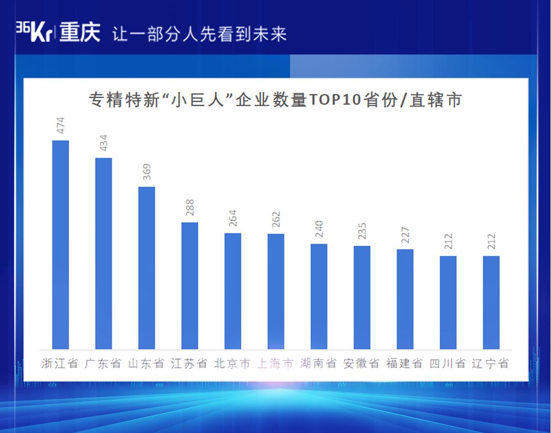 前十的省市自治区包揽了全国六成的“小巨人”企业。浙江省以474家企业位居全国第一,广东、山东分别以434家、367家紧随其后,之后是江苏、北京、上海、湖南、安徽、福建、四川/辽宁(并列)。重庆以124家位列第17位。
