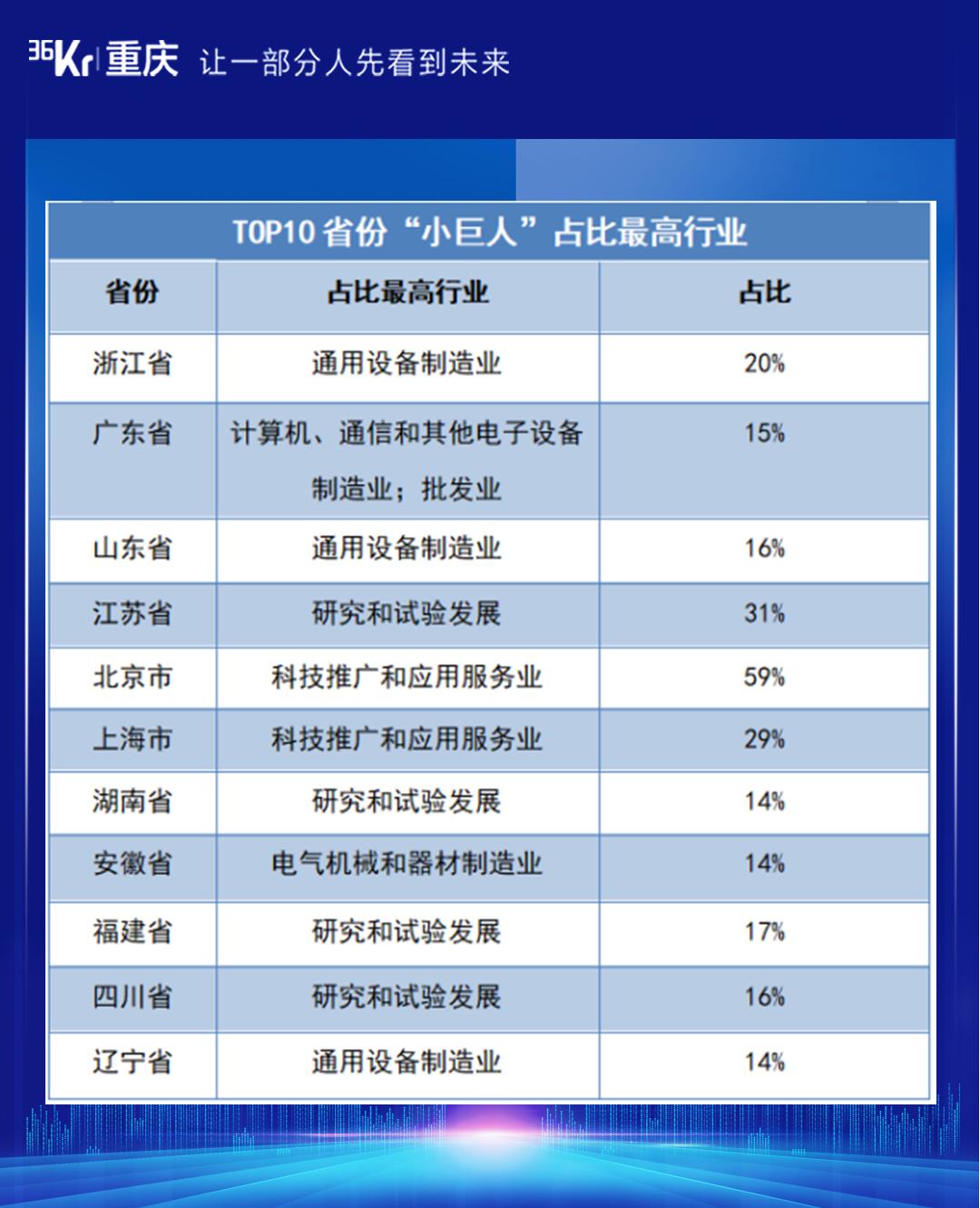 具体到TOP10省份,浙江的“小巨人”的行业以通用设备制造业为主,行业占比20%;还有12%的电气机械和器材制造业,11%的专用设备制造业。江苏则以研究和试验发展业为主,占比高达31%。广东“小巨人”行业构成主要为计算机、通信和其他电子设备制造业(按国家统计局行业分类标准)。