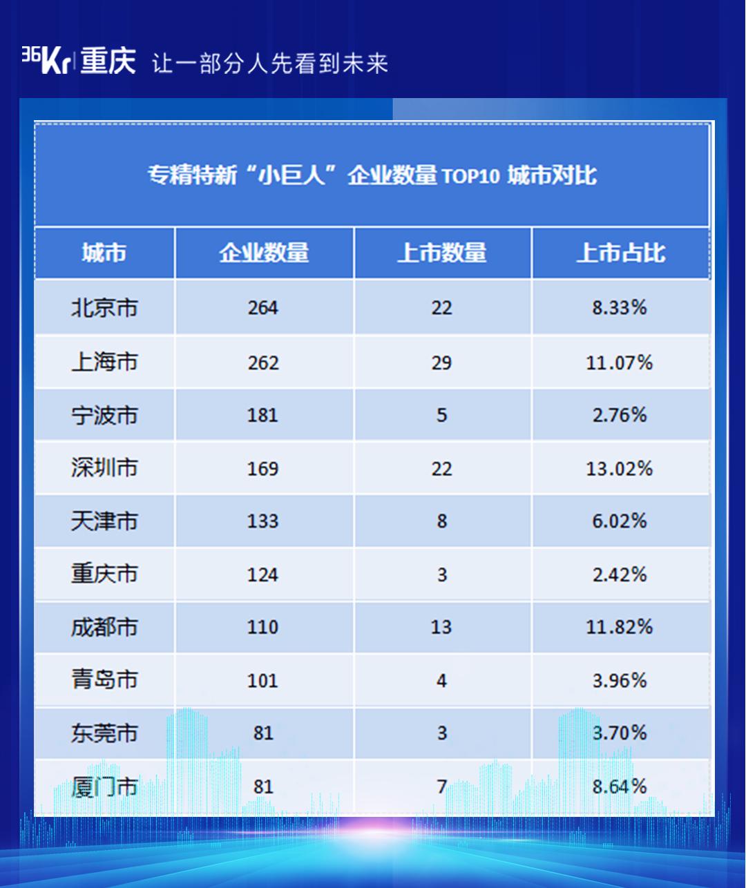 虽然近年来重庆“专精特新”企业的发展情况较好,专精特新“小巨人”企业已有124家,但与成都、宁波、深圳、天津等城市相比,还有不小差距。