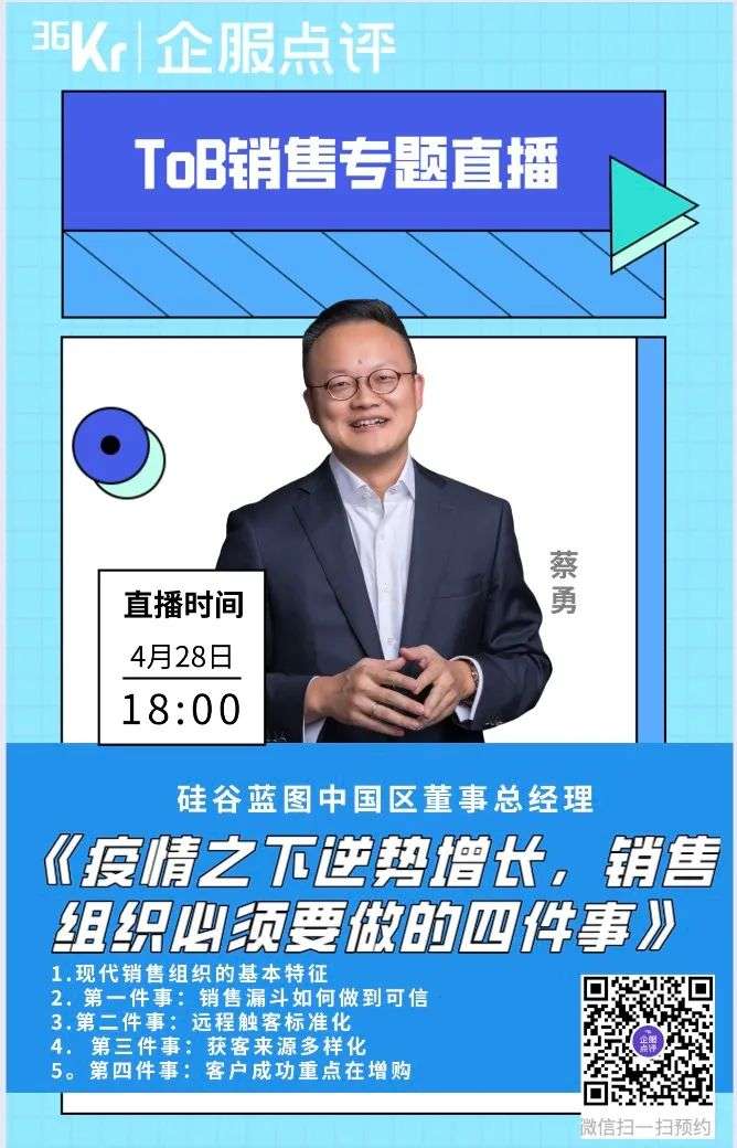 本周四还会跟36氪企服点评合办一次直播,题目就叫“疫情之下逆势增长,销售组织必须要做到的四件事”