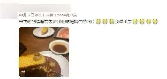 “隔离躺了一天就吃了几片面包,刚刚叫了些萨利亚吃,吃完培根披萨幸福落泪了。”