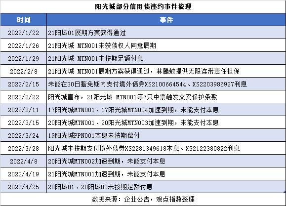 据观点新媒体不完全统计,3月11日及3月15日,阳光城宣布有4只中票加速到期,并因无法按时支付本息而构成违约,共计本息约50.28亿元。于3月下旬还分别有1只PPN以及2只美元债未能按期偿付本息。