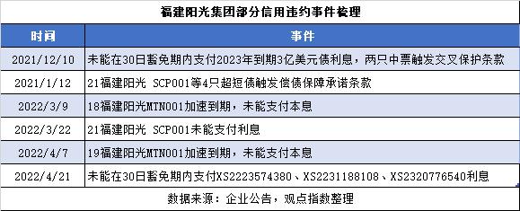 相似的情况在母公司福建阳光集团身上重演,该公司最早于去年12月出现美元债违约,此后4只超短融、2只中票触发违约事件,其中中票均在3-4月份加速到期;4月21日,再新增3只美元债未支付利息,涉及本金合计5.95亿美元。